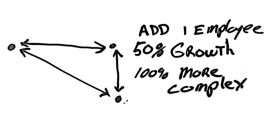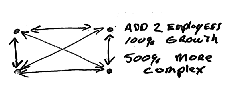 When you add 1 employee, the communication becomes 100% more complex. When you add 2, the communication becomes 500% more complex. So you can see why you so often hear about businesses having problems with expanding too much too fast. Again, less is more.